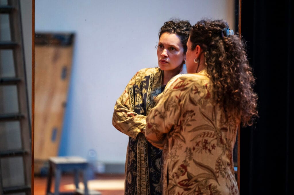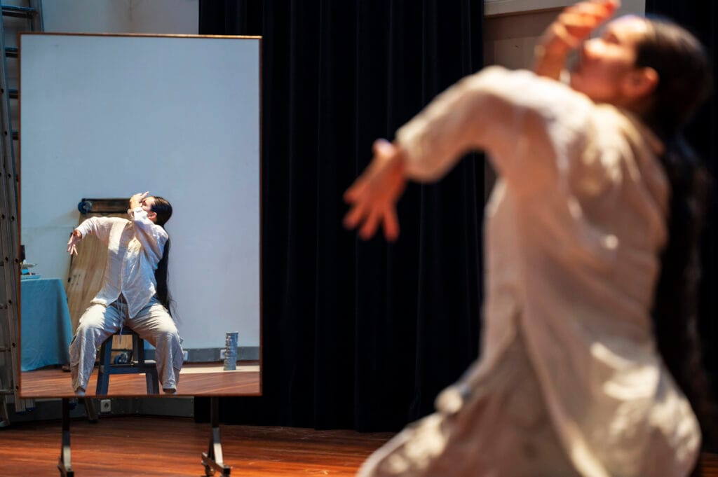 Jam Karet is een interdisciplinaire voorstelling over verbeeldingskracht en het verlangen om opnieuw te mogen beginnen. Actrice Kyra Bououargane en danseres Romee van de Meent geven samen vorm aan Varo’s innerlijke wereld – een plek vol duistere humor en fantasie, waar de tijd lijkt stil te staan.